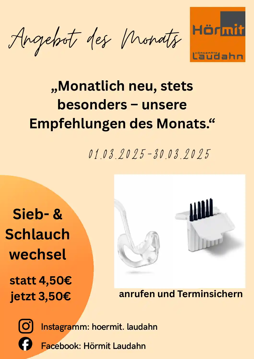 Angebot des Monats – nur im März! Sieb- und Schlauchwechsel für Ihre Hörgeräte – für klare Klangqualität und zuverlässige Funktion.